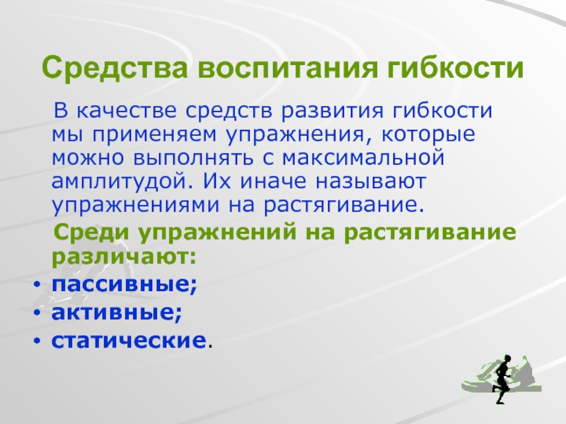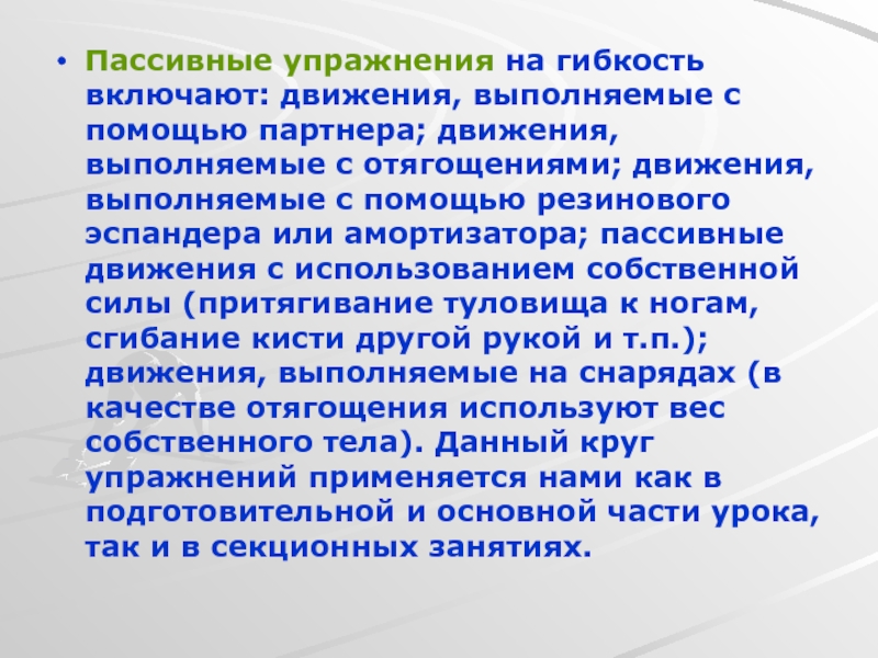 Слайд 12Пассивные упражнения на гибкость включают: движения, выполняемые с помощью партнера; движения,