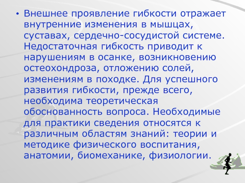 Недостаточная гибкость приводит к нарушениям в осанке, возникновению остеохондроза, отложению солей, изменениям в походке. Для успешного развития гибкости, прежде всего, необходима теоретическая обоснованность вопроса. Необходимые для практики сведения относятся к различным областям знаний: теории и методике физического воспитания, анатомии, биомеханике, физиологии.