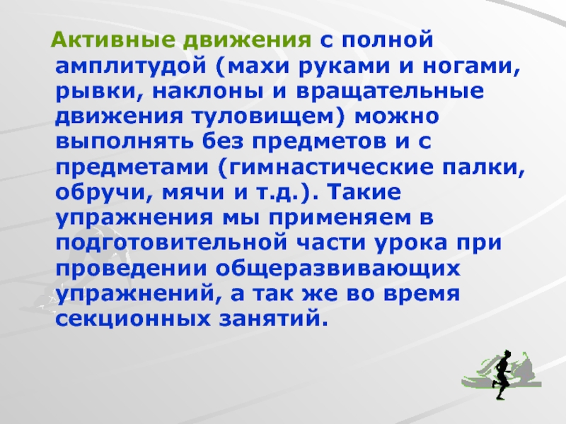 Слайд 10 Активные движения с полной амплитудой (махи руками и ногами,