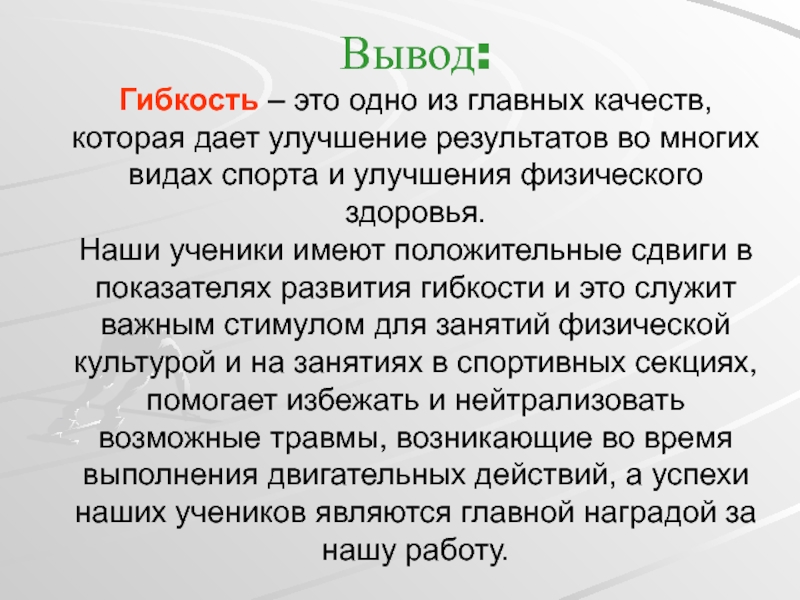 Наши ученики имеют положительные сдвиги в показателях развития гибкости и это служит важным стимулом для занятий физической культурой и на занятиях в спортивных секциях, помогает избежать и нейтрализовать возможные травмы, возникающие во время выполнения двигательных действий, а успехи наших учеников являются главной наградой за нашу работу.