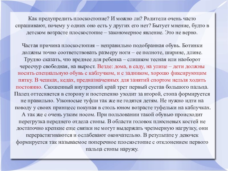 Для решения этой проблемы, прежде всего, необходимо донести до родителей всю серьезность ситуации. Отметить нюансы, на которые нужно обращать внимание, при выборе обуви для своего ребенка. Как важно укреплять его здоровье ежедневно и делать это не навязчиво.