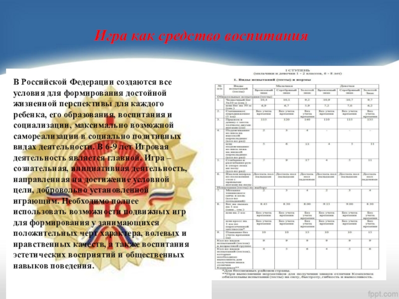 для формирования достойной жизненной перспективы для каждого ребенка, его образования, воспитания и социализации, максимально возможной самореализации в социально позитивных видах деятельности. В 6-9 лет Игровая деятельность является главной. Игра –сознательная, инициативная деятельность, направленная на достижение условной цели, добровольно установленной играющим. Необходимо полнее использовать возможности подвижных игр для формирования у занимающихся положительных черт характера, волевых и нравственных качеств, а также воспитания эстетических восприятий и общественных навыков поведения.