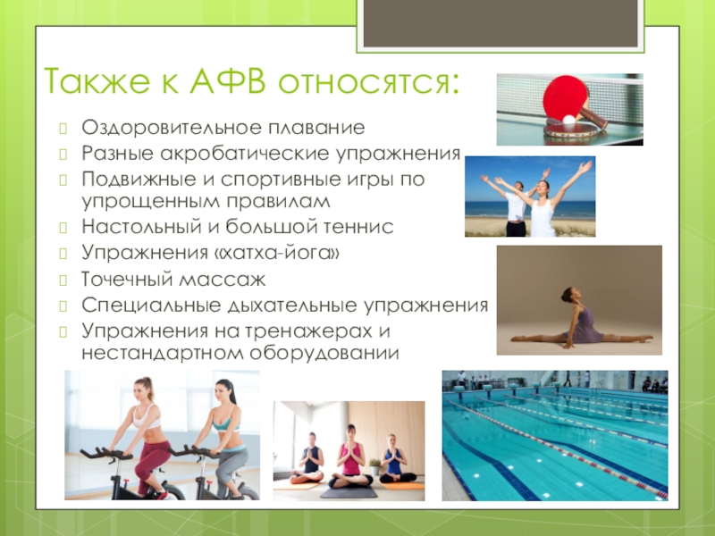 Также к АФВ относятся:Оздоровительное плаваниеРазные акробатические упражненияПодвижные и спортивные игры по упрощенным правиламНастольный и большой теннисУпражнения «хатха-йога»Точечный