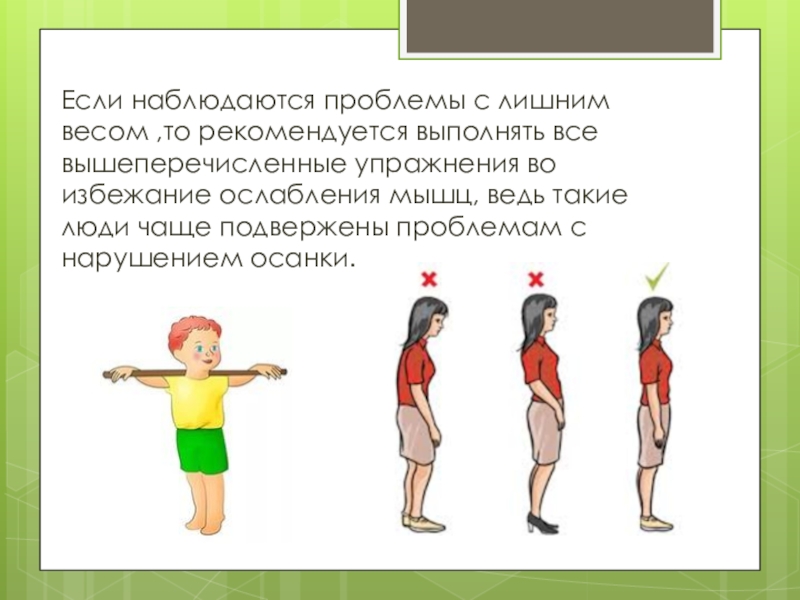упражнения во избежание ослабления мышц, ведь такие люди чаще подвержены проблемам с нарушением осанки.