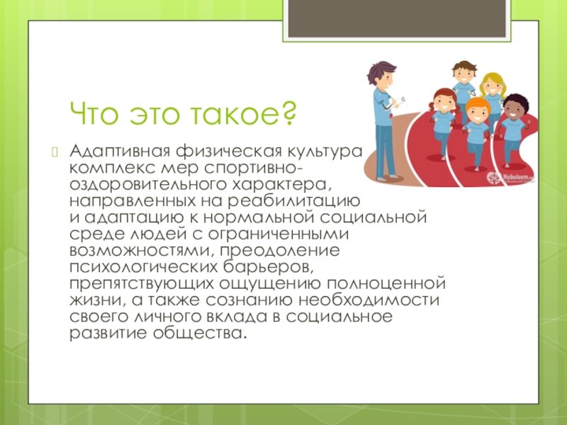 Что это такое?Адаптивная физическая культура-это комплекс мер спортивно-оздоровительного характера, направленных на реабилитацию и адаптацию к нормальной социальной среде людей с