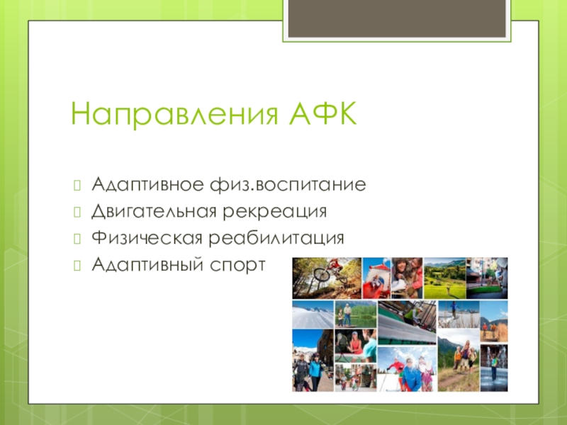 Направления АФКАдаптивное физ.воспитаниеДвигательная рекреацияФизическая реабилитацияАдаптивный спорт
