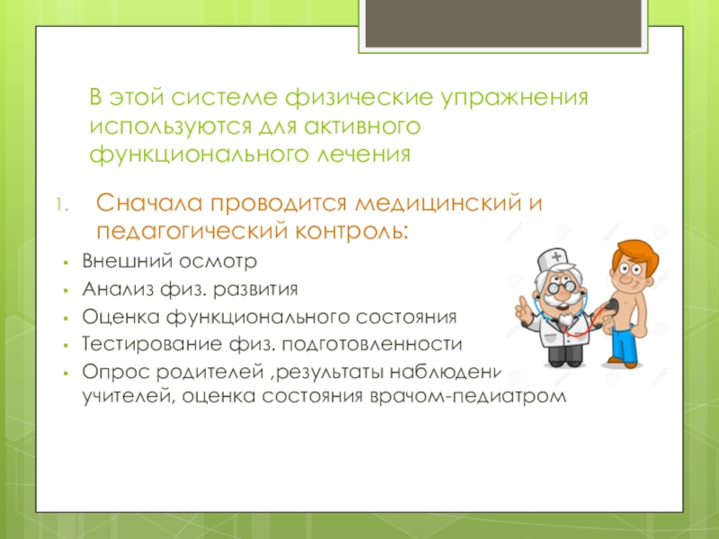 В этой системе физические упражнения используются для активного функционального леченияСначала проводится медицинский и педагогический контроль:Внешний осмотрАнализ физ.