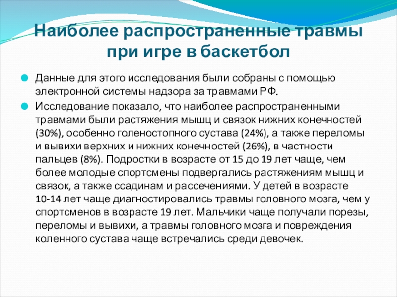 Исследование показало, что наиболее распространенными травмами были растяжения мышц и связок нижних конечностей (30%), особенно голеностопного сустава (24%), а также переломы и вывихи верхних и нижних конечностей (26%), в частности пальцев (8%). Подростки в возрасте от 15 до 19 лет чаще, чем более молодые спортсмены подвергались растяжениям мышц и связок, а также ссадинам и рассечениями. У детей в возрасте 10-14 лет чаще диагностировались травмы головного мозга, чем у спортсменов в возрасте 19 лет. Мальчики чаще получали порезы, переломы и вывихи, а травмы головного мозга и повреждения коленного сустава чаще встречались среди девочек.
