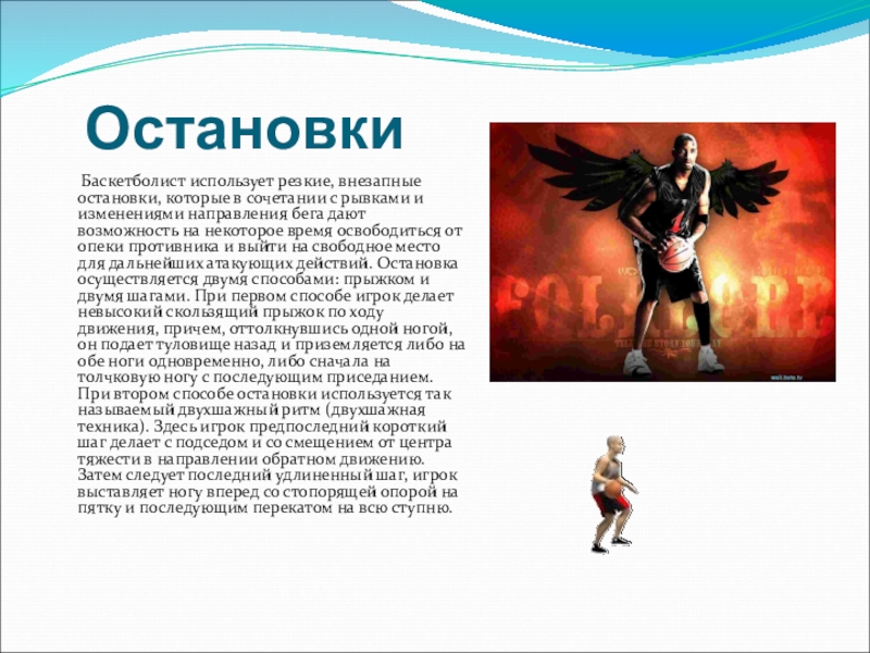 которые в сочетании с рывками и изменениями направления бега дают возможность на некоторое время освободиться от опеки противника и выйти на свободное место для дальнейших атакующих действий. Остановка осуществляется двумя способами: прыжком и двумя шагами. При первом способе игрок делает невысокий скользящий прыжок по ходу движения, причем, оттолкнувшись одной ногой, он подает туловище назад и приземляется либо на обе ноги одновременно, либо сначала на толчковую ногу с последующим приседанием. При втором способе остановки используется так называемый двухшажный ритм (двухшажная техника). Здесь игрок предпоследний короткий шаг делает с подседом и со смещением от центра тяжести в направлении обратном движению. Затем следует последний удлиненный шаг, игрок выставляет ногу вперед со стопорящей опорой на пятку и последующим перекатом на всю ступню.