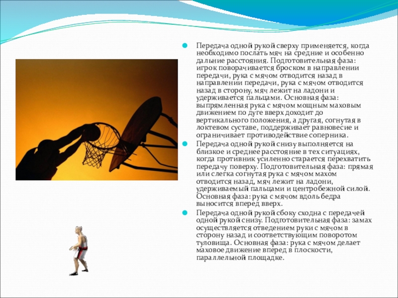 и особенно дальние расстояния. Подготовительная фаза: игрок поворачивается броском в направлении передачи, рука с мячом отводится назад в направлении передачи, рука с мячом отводится назад в сторону, мяч лежит на ладони и удерживается пальцами. Основная фаза: выпрямленная рука с мячом мощным маховым движением по дуге вверх доходит до вертикального положения, а другая, согнутая в локтевом суставе, поддерживает равновесие и ограничивает противодействие соперника.