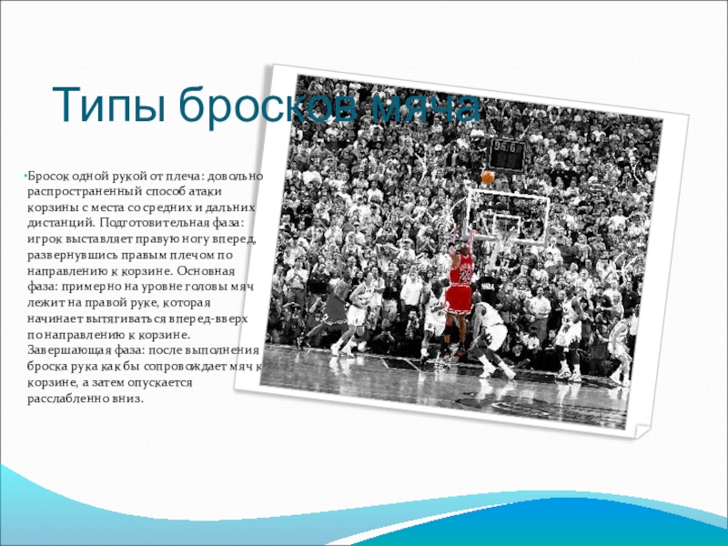 места со средних и дальних дистанций. Подготовительная фаза: игрок выставляет правую ногу вперед, развернувшись правым плечом по направлению к корзине. Основная фаза: примерно на уровне головы мяч лежит на правой руке, которая начинает вытягиваться вперед-вверх по направлению к корзине. Завершающая фаза: после выполнения броска рука как бы сопровождает мяч к корзине, а затем опускается расслабленно вниз.