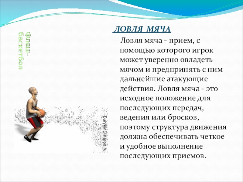 игрок может уверенно овладеть мячом и предпринять с ним дальнейшие атакующие действия. Ловля мяча - это исходное положение для последующих передач, ведения или бросков, поэтому структура движения должна обеспечивать четкое и удобное выполнение последующих приемов.