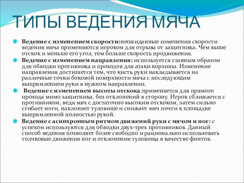 Слайд 17ТИПЫ ВЕДЕНИЯ МЯЧА