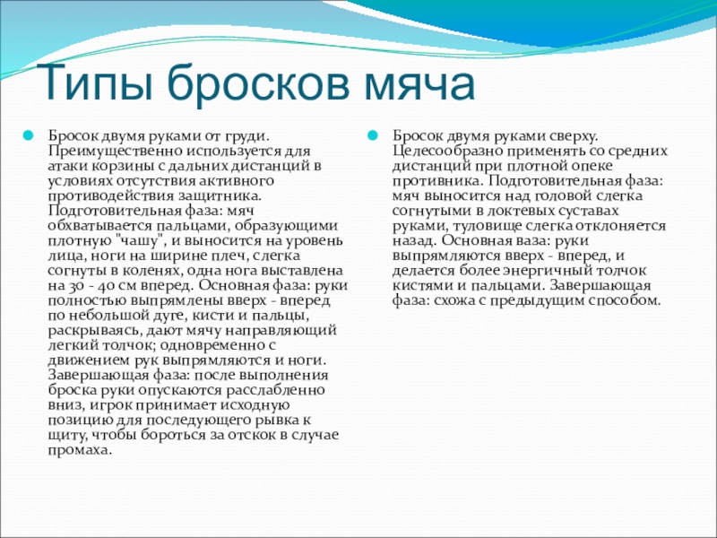 дальних дистанций в условиях отсутствия активного противодействия защитника. Подготовительная фаза: мяч обхватывается пальцами, образующими плотную "чашу", и выносится на уровень лица, ноги на ширине плеч, слегка согнуты в коленях, одна нога выставлена на 30 - 40 см вперед. Основная фаза: руки полностью выпрямлены вверх - вперед по небольшой дуге, кисти и пальцы, раскрываясь, дают мячу направляющий легкий толчок; одновременно с движением рук выпрямляются и ноги. Завершающая фаза: после выполнения броска руки опускаются расслабленно вниз, игрок принимает исходную позицию для последующего рывка к щиту, чтобы бороться за отскок в случае промаха.