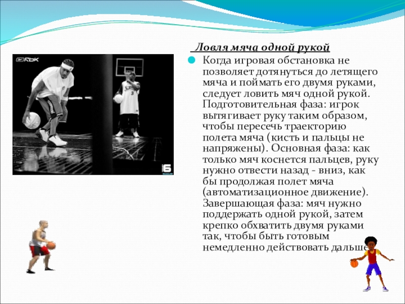 летящего мяча и поймать его двумя руками, следует ловить мяч одной рукой. Подготовительная фаза: игрок вытягивает руку таким образом, чтобы пересечь траекторию полета мяча (кисть и пальцы не напряжены). Основная фаза: как только мяч коснется пальцев, руку нужно отвести назад - вниз, как бы продолжая полет мяча (автоматизационное движение). Завершающая фаза: мяч нужно поддержать одной рукой, затем крепко обхватить двумя руками так, чтобы быть готовым немедленно действовать дальше.