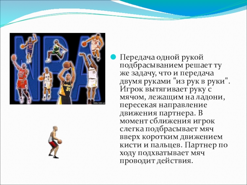 Слайд 15Передача одной рукой подбрасыванием решает ту же задачу, что и передача