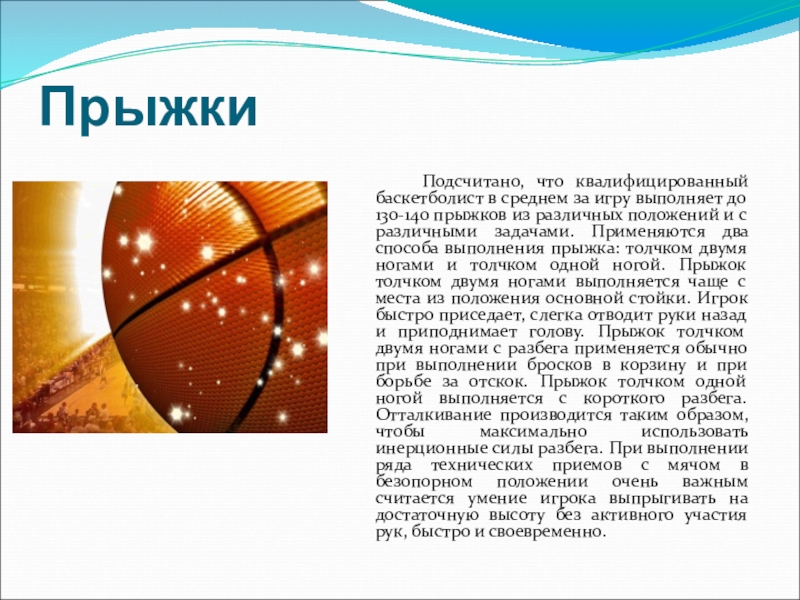 выполняет до 130-140 прыжков из различных положений и с различными задачами. Применяются два способа выполнения прыжка: толчком двумя ногами и толчком одной ногой. Прыжок толчком двумя ногами выполняется чаще с места из положения основной стойки. Игрок быстро приседает, слегка отводит руки назад и приподнимает голову. Прыжок толчком двумя ногами с разбега применяется обычно при выполнении бросков в корзину и при борьбе за отскок. Прыжок толчком одной ногой выполняется с короткого разбега. Отталкивание производится таким образом, чтобы максимально использовать инерционные силы разбега. При выполнении ряда технических приемов с мячом в безопорном положении очень важным считается умение игрока выпрыгивать на достаточную высоту без активного участия рук, быстро и своевременно.