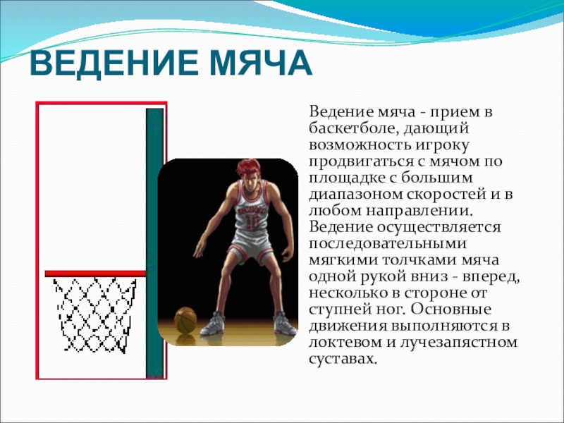 игроку продвигаться с мячом по площадке с большим диапазоном скоростей и в любом направлении. Ведение осуществляется последовательными мягкими толчками мяча одной рукой вниз - вперед, несколько в стороне от ступней ног. Основные движения выполняются в локтевом и лучезапястном суставах.