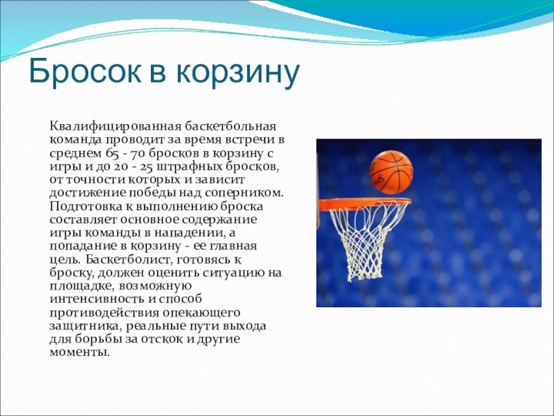 встречи в среднем 65 - 70 бросков в корзину с игры и до 20 - 25 штрафных бросков, от точности которых и зависит достижение победы над соперником. Подготовка к выполнению броска составляет основное содержание игры команды в нападении, а попадание в корзину - ее главная цель. Баскетболист, готовясь к броску, должен оценить ситуацию на площадке, возможную интенсивность и способ противодействия опекающего защитника, реальные пути выхода для борьбы за отскок и другие моменты.
