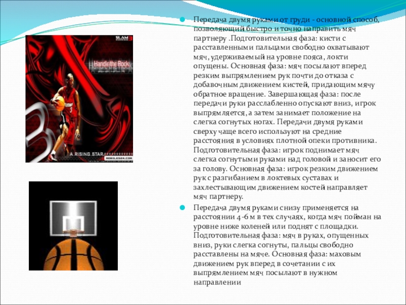 Слайд 12Передача двумя руками от груди - основной способ, позволяющий быстро и