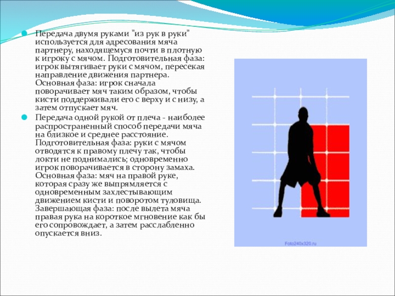 точно направить мяч партнеру .Подготовительная фаза: кисти с расставленными пальцами свободно охватывают мяч, удерживаемый на уровне пояса, локти опущены. Основная фаза: мяч посылают вперед резким выпрямлением рук почти до отказа с добавочным движением кистей, придающим мячу обратное вращение. Завершающая фаза: после передачи руки расслабленно опускают вниз, игрок выпрямляется, а затем занимает положение на слегка согнутых ногах. Передачи двумя руками сверху чаще всего используют на средние расстояния в условиях плотной опеки противника. Подготовительная фаза: игрок поднимает мяч слегка согнутыми руками над головой и заносит его за голову. Основная фаза: игрок резким движением рук с разгибанием в локтевых суставах и захлестывающим движением костей направляет мяч партнеру.