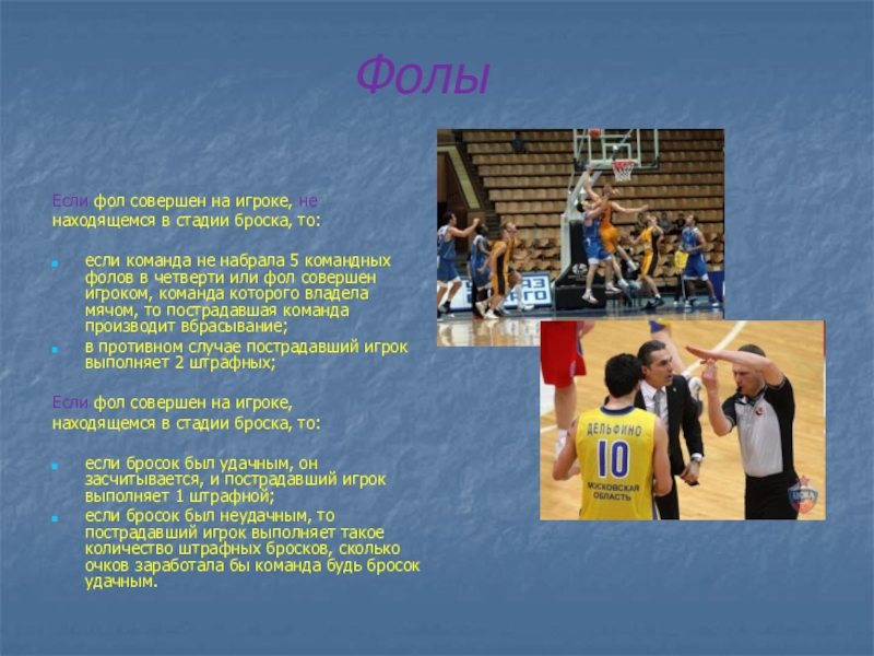 не набрала 5 командных фолов в четверти или фол совершен игроком, команда которого владела мячом, то пострадавшая команда производит вбрасывание;