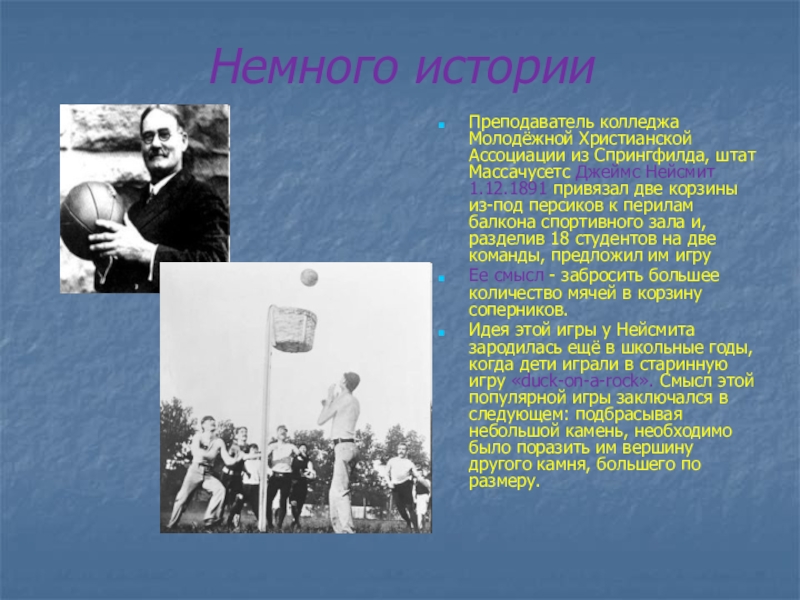 Нейсмит 1.12.1891 привязал две корзины из-под персиков к перилам балкона спортивного зала и, разделив 18 студентов на две команды, предложил им игру