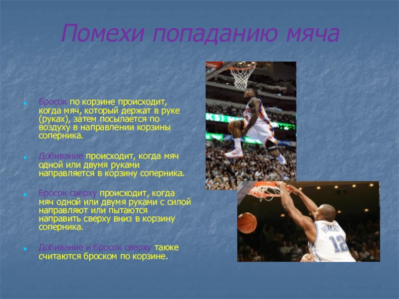 Добивание происходит, когда мяч одной или двумя руками направляется в корзину соперника.