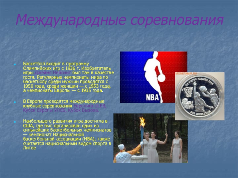Баскетбол входит в программу Олимпийских игр с 1936 г. Изобретатель