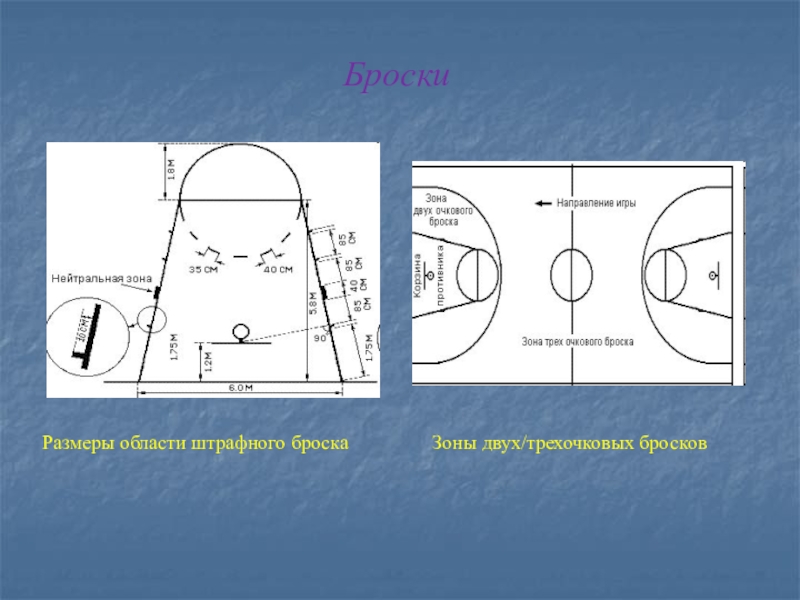 - 3 очка — бросок из-за трёхочковой линии на расстоянии 6м 75см (7м 24 см в Национальной баскетбольной ассоциации)
