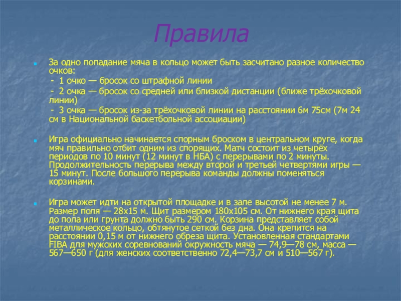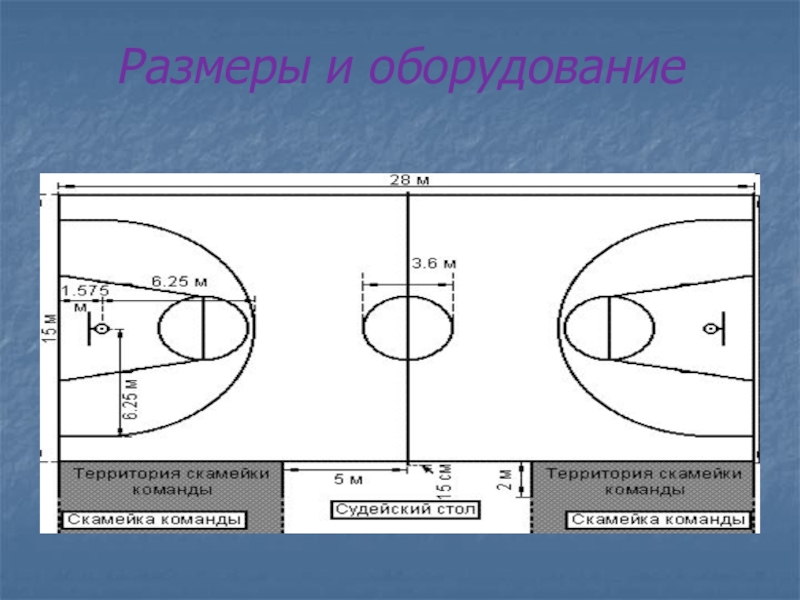 Всего в команде 12 человек, замены не ограничены. За мяч, заброшенный с ближней и средней дистанции, засчитывается 2 очка, с дальней — 3 очка. Штрафной бросок оценивается в 1 очко. Стандартный размер баскетбольной площадки 28 метров в длину и 15 метров в ширину.