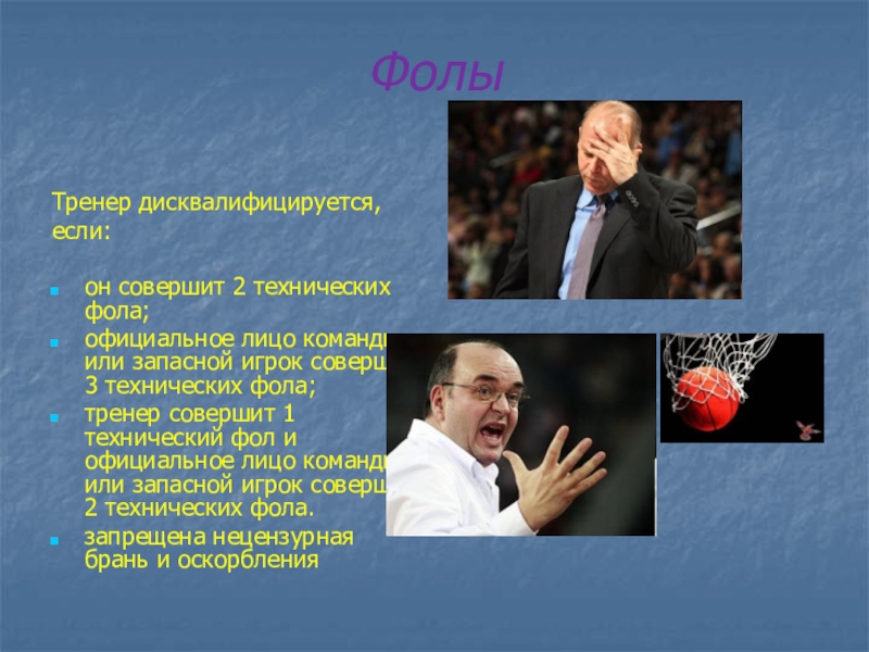 тренер совершит 1 технический фол и официальное лицо команды или запасной игрок совершат 2 технических фола.