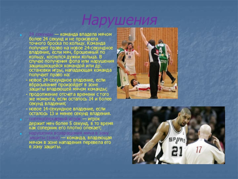 плотноопекаемый игрок — игрок держит мяч более 5 секунд, в то время как соперник его плотно опекает;