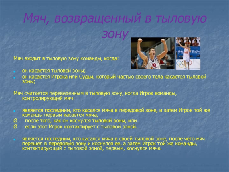 нарушения возвращения мяча в зону защиты (зона) — команда, владеющая мячом в зоне нападения перевела его в зону защиты.
