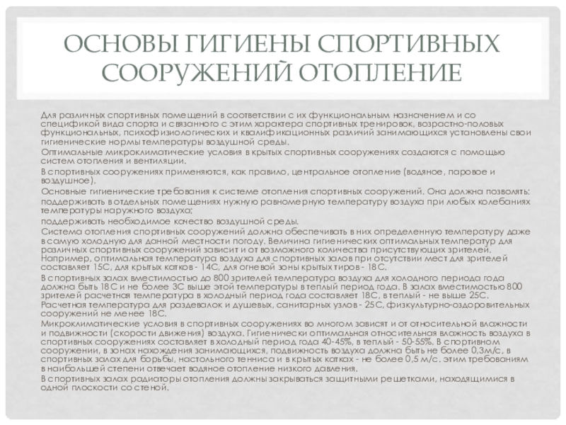 Слайд 12Основы гигиены спортивных сооружений отопление