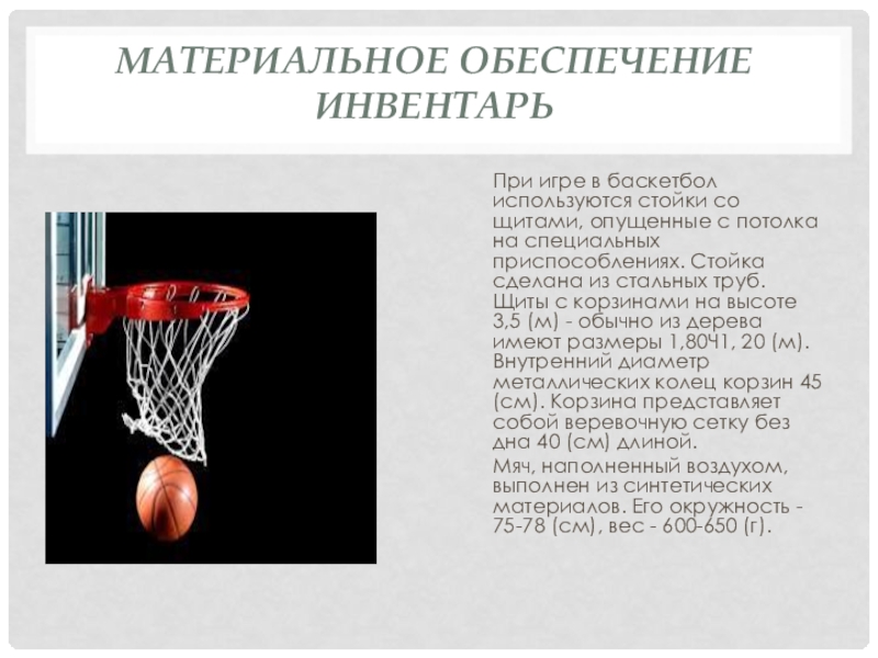 с потолка на специальных приспособлениях. Стойка сделана из стальных труб. Щиты с корзинами на высоте 3,5 (м) - обычно из дерева имеют размеры 1,80Ч1, 20 (м). Внутренний диаметр металлических колец корзин 45 (см). Корзина представляет собой веревочную сетку без дна 40 (см) длиной.