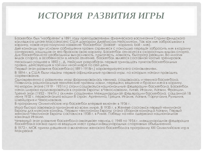 Несколько позднее в 1892 г., Д. Нейсмит разработал первые тринадцать пунктов баскетбольных правил, действующих в той или иной мере по сей день.
