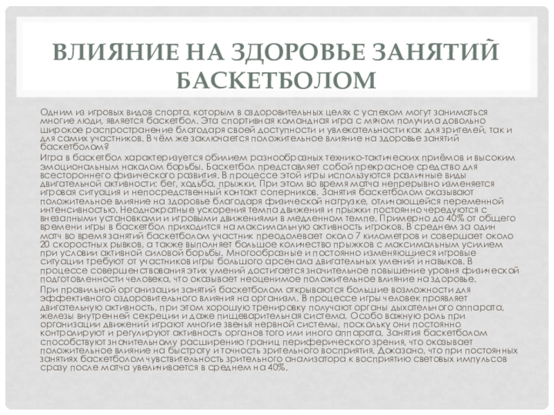 Игра в баскетбол характеризуется обилием разнообразных технико-тактических приёмов и высоким эмоциональным накалом борьбы. Баскетбол представляет собой прекрасное средство для всестороннего физического развития. В процессе этой игры используются различные виды двигательной активности: бег, ходьба, прыжки. При этом во время матча непрерывно изменяется игровая ситуация и непосредственный контакт соперников. Занятия баскетболом оказывают положительное влияние на здоровье благодаря физической нагрузке, отличающейся переменной интенсивностью. Неоднократные ускорения темпа движения и прыжки постоянно чередуются с внезапными установками и игровыми движениями в медленном темпе. Примерно до 40% от общего времени игры в баскетбол приходится на максимальную активность игроков. В среднем за один матч во время занятий баскетболом участник преодолевает около 7 километров и совершает около 20 скоростных рывков, а также выполняет большое количество прыжков с максимальным усилием при условии активной силовой борьбы. Многообразные и постоянно изменяющиеся игровые ситуации требуют от участников игры большого арсенала двигательных умений и навыков. В процессе совершенствования этих умений достигается значительное повышение уровня физической подготовленности человека, что оказывает неоценимое положительное влияние на здоровье.