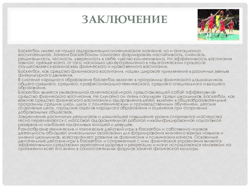 Баскетбол имеет не только оздоровительно-гигиеническое значение, но и агитационно-воспитательное. Занятия баскетболом