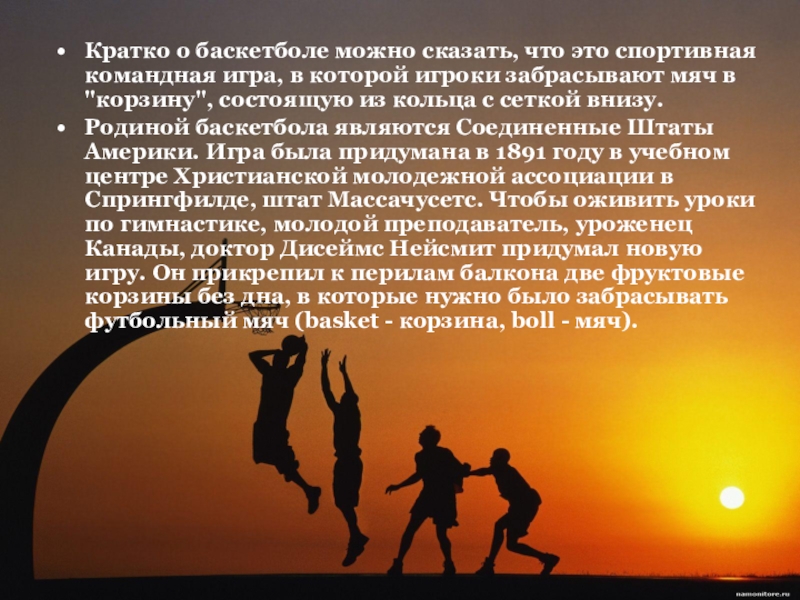 Слайд 3Кратко о баскетболе можно сказать, что это спортивная командная игра, в