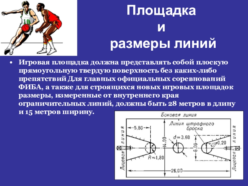 поверхность без каких-либо препятствий Для главных официальных соревнований ФИБА, а также для строящихся новых игровых площадок размеры, измеренные от внутреннего края ограничительных линий, должны быть 28 метров в длину и 15 метров ширину.