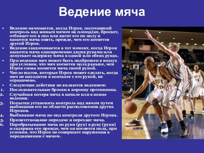 Ведение заканчивается в тот момент, когда Игрок касается мяча одновременно двумя руками или допускает задержку мяча в одной или обеих руках.
