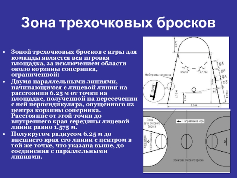 Двумя параллельными линиями, начинающимся с лицевой линии на расстоянии 6.25 м от точки на площадке, полученной на пересечении с ней перпендикуляра, опущенного из центра корзины соперника. Расстояние от этой точки до внутреннего края середины лицевой линии равно 1.575 м.