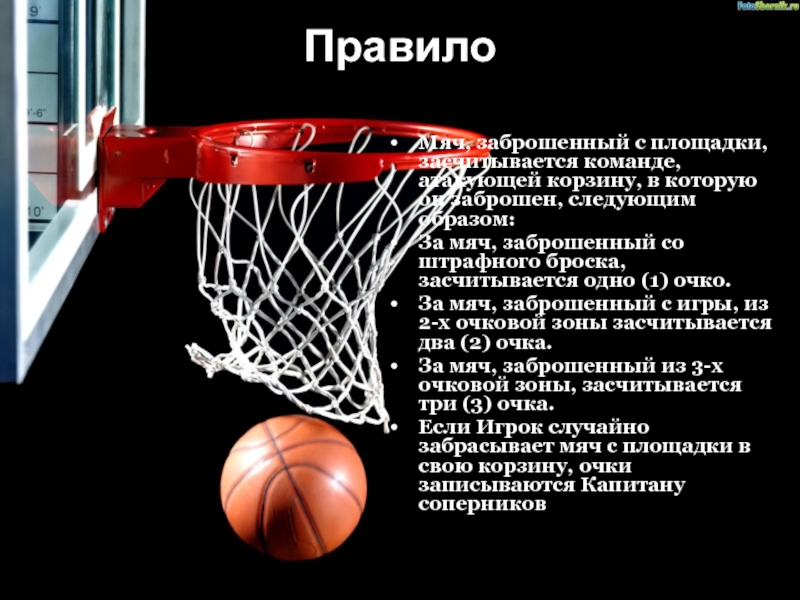 Мяч, заброшенный с площадки, засчитывается команде, атакующей корзину, в которую