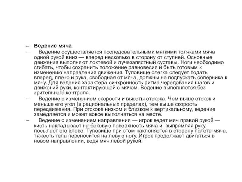 вниз — вперед несколько в сторону от ступней. Основные движения выполняют локтевой и лучезапястный суставы. Ноги необходимо сгибать, чтобы сохранить положение равновесия и быть готовым к изменению направления движения. Туловище слегка следует подать вперед, плечо и рука, свободная от мяча, должны не подпускать соперника к мячу. Для ведения характера синхронность ритма чередования шагов и движений руки, контактирующей с мячом. Ведение выполняется без зрительного контроля.