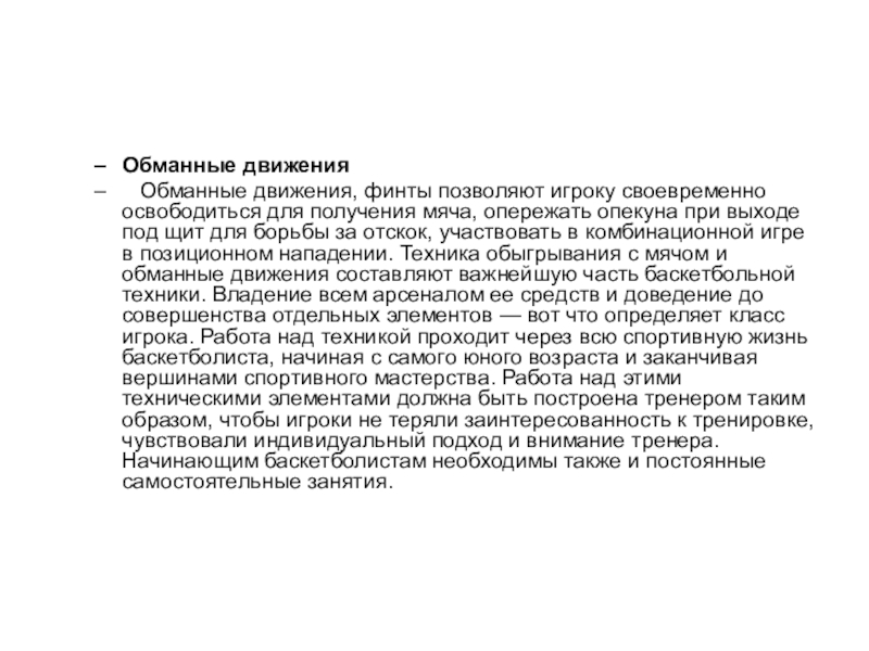 получения мяча, опережать опекуна при выходе под щит для борьбы за отскок, участвовать в комбинационной игре в позиционном нападении. Техника обыгрывания с мячом и обманные движения составляют важнейшую часть баскетбольной техники. Владение всем арсеналом ее средств и доведение до совершенства отдельных элементов — вот что определяет класс игрока. Работа над техникой проходит через всю спортивную жизнь баскетболиста, начиная с самого юного возраста и заканчивая вершинами спортивного мастерства. Работа над этими техническими элементами должна быть построена тренером таким образом, чтобы игроки не теряли заинтересованность к тренировке, чувствовали индивидуальный подход и внимание тренера. Начинающим баскетболистам необходимы также и постоянные самостоятельные занятия.