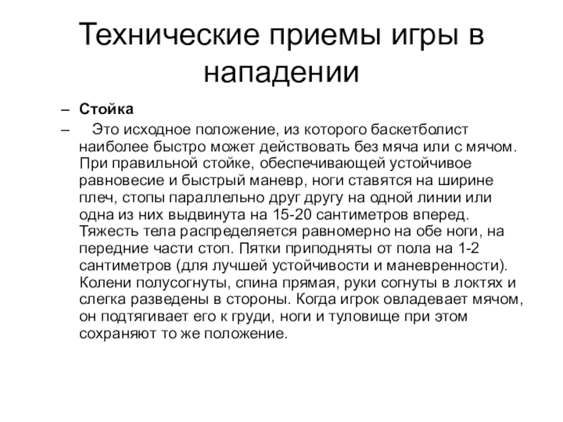 которого баскетболист наиболее быстро может действовать без мяча или с мячом. При правильной стойке, обеспечивающей устойчивое равновесие и быстрый маневр, ноги ставятся на ширине плеч, стопы параллельно друг другу на одной линии или одна из них выдвинута на 15-20 сантиметров вперед. Тяжесть тела распределяется равномерно на обе ноги, на передние части стоп. Пятки приподняты от пола на 1-2 сантиметров (для лучшей устойчивости и маневренности). Колени полусогнуты, спина прямая, руки согнуты в локтях и слегка разведены в стороны. Когда игрок овладевает мячом, он подтягивает его к груди, ноги и туловище при этом сохраняют то же положение.