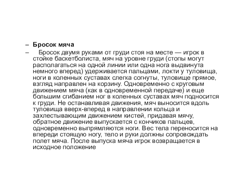— игрок в стойке баскетболиста, мяч на уровне груди (стопы могут располагаться на одной линии или одна нога выдвинута немного вперед) удерживается пальцами, локти у туловища, ноги в коленных суставах слегка согнуты, туловище прямое, взгляд направлен на корзину. Одновременно с круговым движением мяча (как в одновременной передаче) и еще большим сгибанием ног в коленных суставах мяч подносится к груди. Не останавливая движения, мяч выносится вдоль туловища вверх-вперед в направлении кольца и захлестывающим движением кистей, придавая мячу, обратное движение выпускается с кончиков пальцев, одновременно выпрямляются ноги. Вес тела переносится на впереди стоящую ногу, тело и руки должны сопровождать полет мяча. После выпуска мяча игрок возвращается в исходное положение