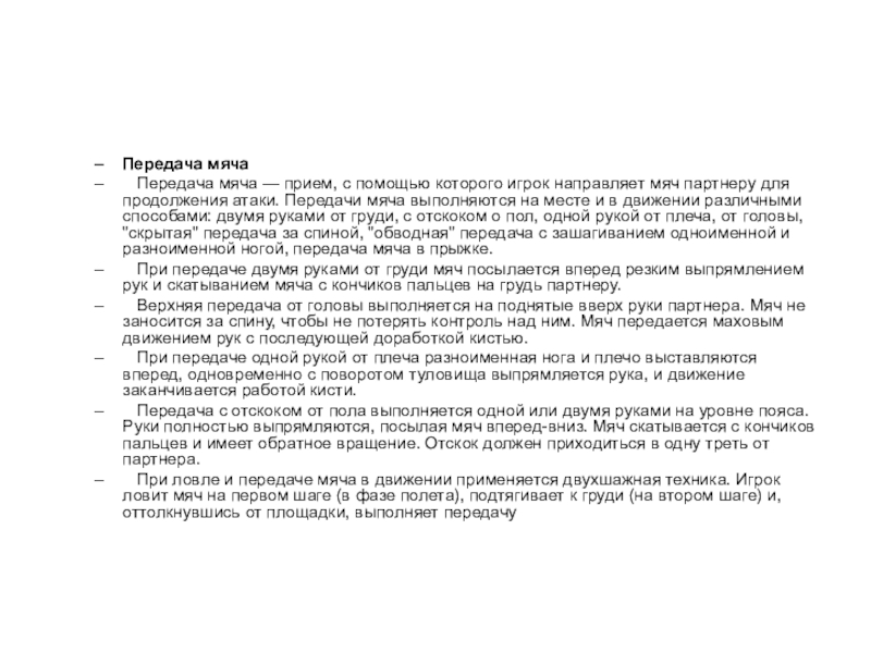 направляет мяч партнеру для продолжения атаки. Передачи мяча выполняются на месте и в движении различными способами: двумя руками от груди, с отскоком о пол, одной рукой от плеча, от головы, "скрытая" передача за спиной, "обводная" передача с зашагиванием одноименной и разноименной ногой, передача мяча в прыжке.