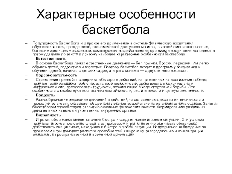 воспитания обуславливаются, прежде всего, экономической доступностью игры, высокой эмоциональностью, большим зрелищным эффектом, комплексным воздействием на организм и воспитание молодежи, а потому дальше по тексту я привожу наиболее характерные особенности баскетбола.